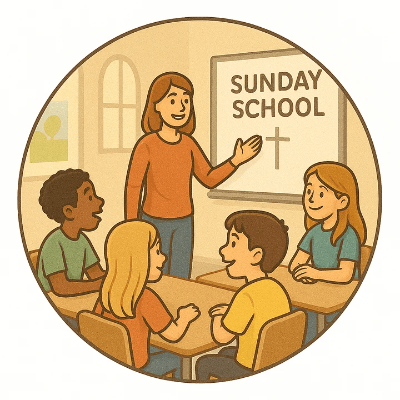 - After worship, kids head downstairs for Children’s Ministry — fun, safe, and faith-building